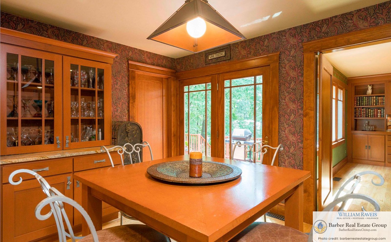 This homage is most evident in the living room, where a stately river stone fireplace and Craftsman-style wood wainscoting take center stage. The same meticulous attention to detail continues throughout the home, especially in the kitchen and dining room, where rich woodworking and period-inspired wallpaper add warmth and authenticity.